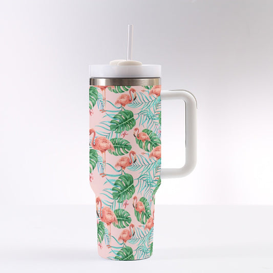 Pink Flamingo 40 oz Tumbler with Handle Straw, Tropical Stainless Steel Cup Travel Mug Coffee Insulated Sublimation Office Gift Men Women