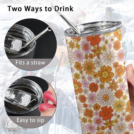 Retro Floral Tumbler 20oz Lid Straw, Flowers Orange Pink Vintage Stainless Steel Travel Mug Insulated Cup Flask Coffee Traveler Custom Women
