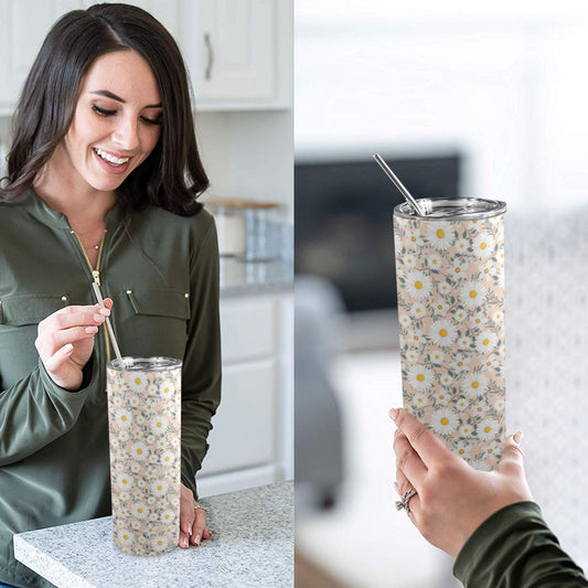Daisy Floral Tumbler 20oz Lid Straw, Flowers Pink Vintage Stainless Steel Metal Travel Mug Insulated Cup Flask Coffee Traveler Custom Women