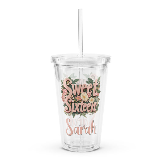 Custom Sweet Sixteen Clear Plastic Tumbler, Personalized 16th Birthday Cup Lid and Straw Drinking Glasses 16oz Reusable Coffee Insulated
