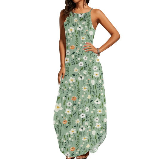 Green Floral Maxi Dress, Women Flowers Sage Green Olive Sleeveless Casual Cute Designer Elegant Plus Size Cocktail Party Summer Designer