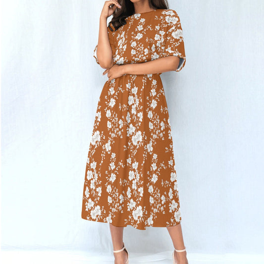 Floral Brown Orange Women Maxi Dress, Fall Flowers Elastic Waist Flowy Long Ankle Length Short Sleeve Pockets Boho Cute Ladies Designer