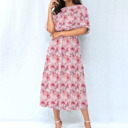 Pink Hibiscus Flowers Women Maxi Dress, Elastic Waist Flowy Long Ankle Length Short Sleeve Pockets Boho Spring Summer Cute Ladies Designer