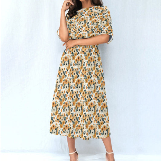 Brown Gold Floral Women Maxi Dress, Fall Flowers Elastic Waist Flowy Long Ankle Length Short Sleeve Pockets Spring Summer Ladies Designer