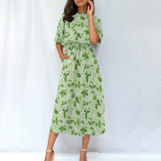 Mint Green Women Maxi Dress, White Flowers Floral Elastic Waist Long Ankle Length Boho Short Sleeve Casual Spring Summer Flowy Ladies