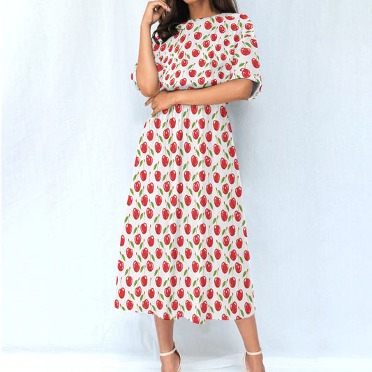 Red Cherry Women Maxi Dress, White Print Elastic Waist Long Ankle Length Boho Short Sleeve Casual Spring Summer Cute Ladies Designer