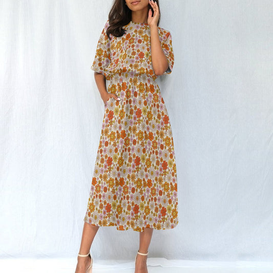Retro Floral Women Maxi Dress, Pink Orange Groovy Flowers Elastic Waist Long Ankle Length Short Sleeve Pockets Spring Summer Cute Ladies