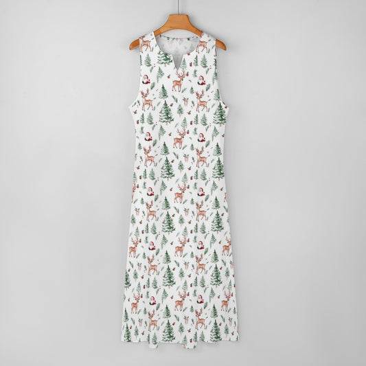 White Christmas Maxi Dress, Holiday Xmas Trees Reindeer Santa Women Sleeveless Casual Cute Designer Plus Size Cocktail Party Designer
