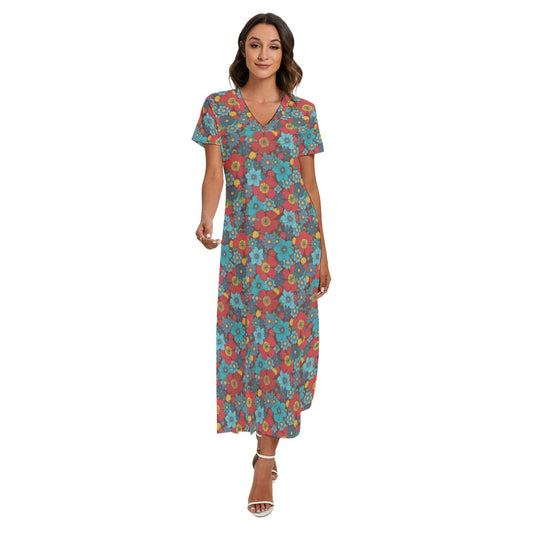 Retro Floral Women V-neck Maxi Dress With Side Slit Ankle Length, Vintage Blue Red Flowers Boho Short Sleeve Casual Summer Cute Designer