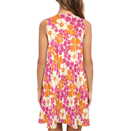 Pink Orange Floral Tank Dress Women Pockets, Vintage Flowers Retro Groovy 70s Print Summer Sleeveless Mini Short Cute Handmade Party Casual