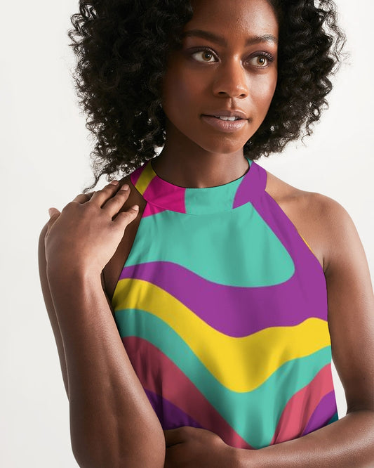 Funky Trippy Women Halter Dress, Colorful Retro Vintage 70s Summer Sleeveless Cocktail Mini Cute Handmade Designer Dress