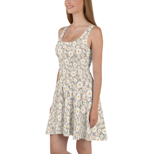 Daisy Flowers Skater Dress, Pastel Floral Print Summer Sleeveless Mini Short Cute Handmade Cocktail Party Sexy Women