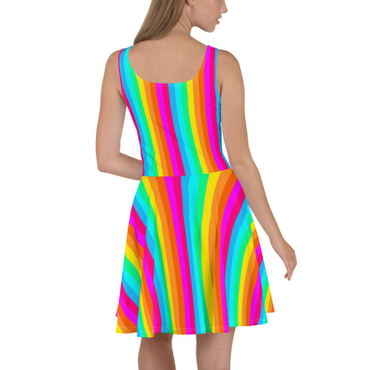 Rainbow Stripe Skater Dress Women, Fit and Flare Colorful Pride Festival Party Fun Mini Sleeveless Vertical Striped Circle Short Cocktail