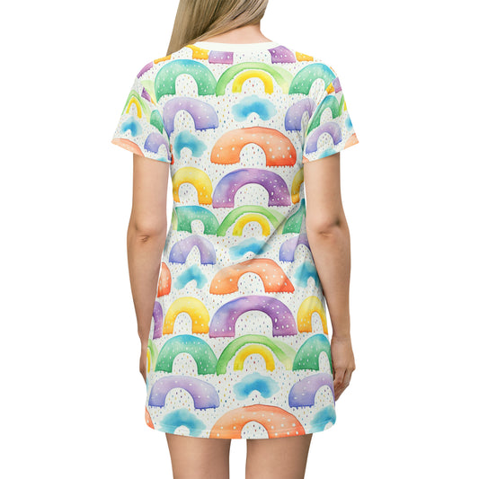 Rainbows Tshirt Dress, Watercolor Women Summer Beach Cute Festival Party Casual Designer Short Sleeve Girls Ladies Cover Up Tee