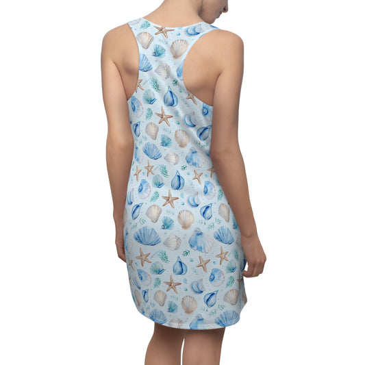 Sea Shells Women Dress, Ocean Star Fish Blue Beach Cover Up Summer Sleeveless Cocktail Mini Cute Handmade Designer Racerback Tank