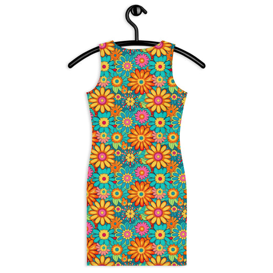 70s Floral Bodycon Dress, Groovy Green Hippie Colorful Pencil Fitted Homecoming Sleeveless Mini Cute Party Women Sexy