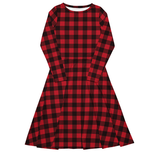 Red Buffalo Plaid Long Sleeve Midi Dress with Pockets, Black Check Women Casual Cute Designer Flare Elegant Plus Size Dress
