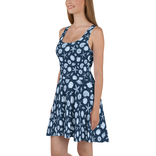 Seashell Skater Dress, Ocean Sea Blue Print Summer Sleeveless Mini Short Cute Handmade Cocktail Party Sexy Women