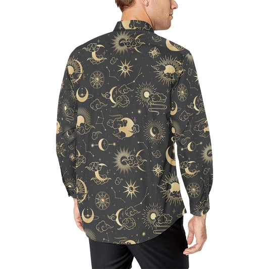 Moon Sun Long Sleeve Men Button Up Shirt, Space Stars Universe Constellation Print Buttoned Collared Dress Shirt with Chest Pocket