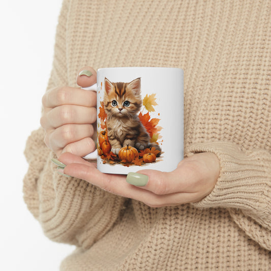 Cat Fall Pumpkins Coffee Mug, Autumn Leaves Kitten Thanksgiving Cute Art Ceramic Cup Tea Hot Chocolate Unique Cool Novelty