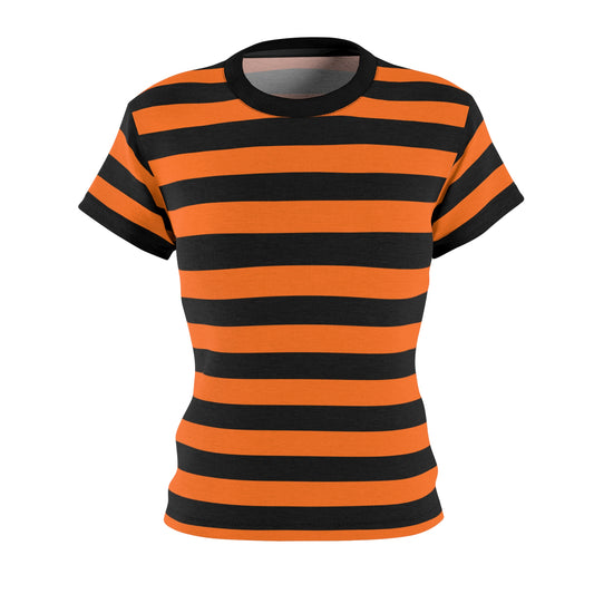 Black and Orange Striped Women Tshirt, Halloween Designer Adult Graphic Aesthetic Fashion Fitted Crewneck Tee Shirt Top