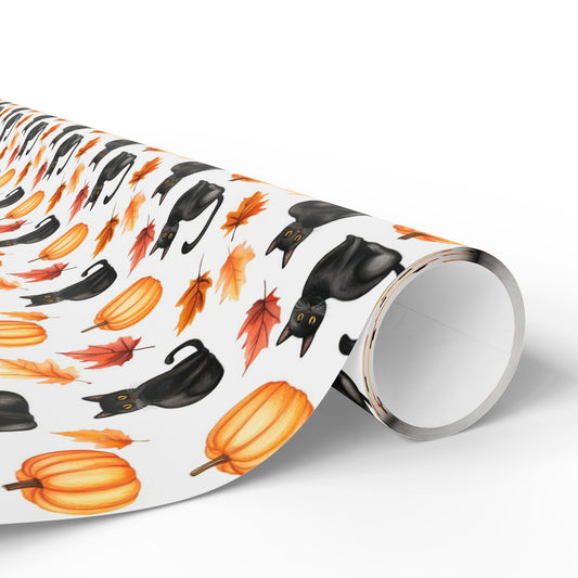 Black Cat Pumpkins Fall Leaves Wrapping Paper, Orange White Autumn Thanksgiving Print Art Packing Gift Wrap Decor Vintage Present Wrapper Roll