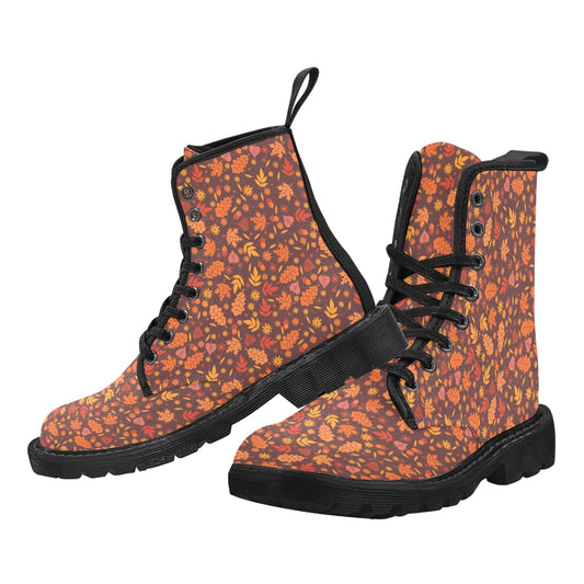 Fall Maple Leaf Women Canvas Boots, Cute Brown Red Autumn Vegan Lace Up Shoes Print Black Ankle Combat Casual Ladies Female Winter Boots