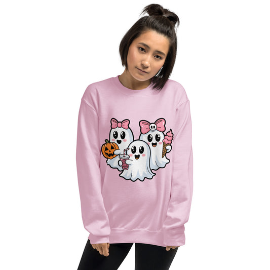 Pink Halloween Sweatshirt, Cute Ghosts Bows Pumpkin Fall Spooky Graphic Crewneck Cotton Sweater Jumper Pullover Men Women Aesthetic Top