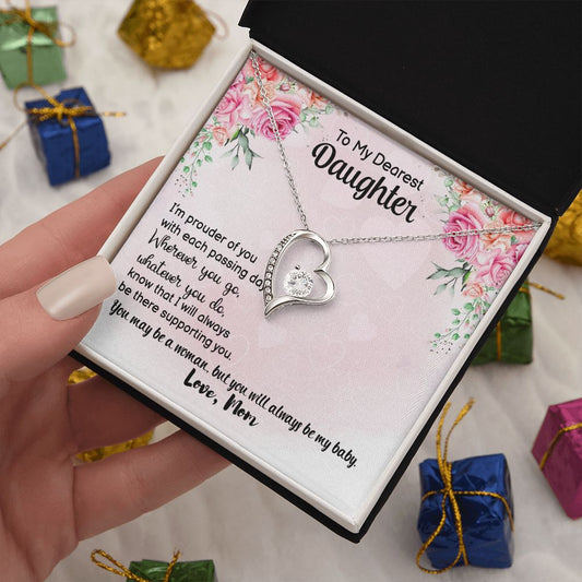 Daughter Necklace from Mom, Always Be My Baby Message Card Mother Forever Love Pendant Gold Finish Jewelry Birthday Christmas Gift