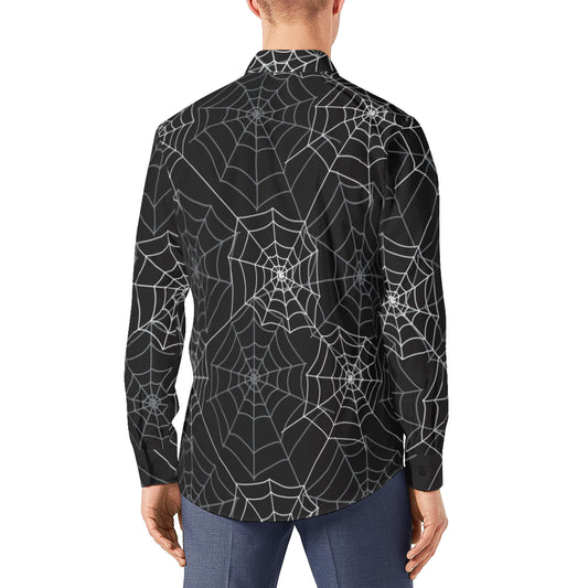 Spiderweb Long Sleeve Men Button Up Shirt, Halloween Black Creepy Guys Male Print Buttoned Down Collared Graphic Casual Dress Plus Size