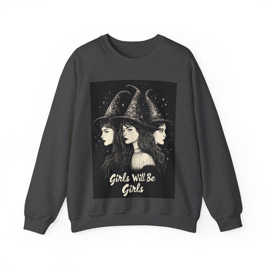 Witches Girls Will Be Girls Sweatshirt, Vintage Retro Halloween Feminist Graphic Crewneck Cotton Sweater Jumper Pullover Women Unisex Top