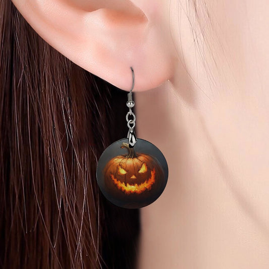 Halloween Pumpkin Round Earrings (2), Jack O Lantern Wooden Dangle Drop Unique Statement Women Girls Vintage Pendant Designer Jewelry