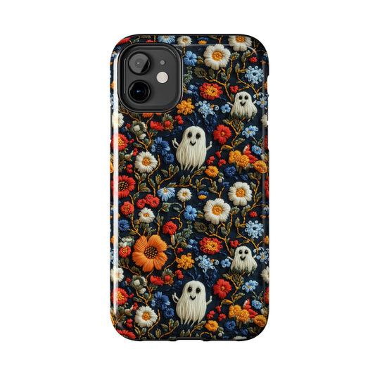 Cute Ghosts Tough Phone Case, Faux Embroidery Floral Halloween iPhone 15 14 13 Pro Max 12 11 8 Plus X XR XS Samsung Galaxy S24 S23 S22 S21
