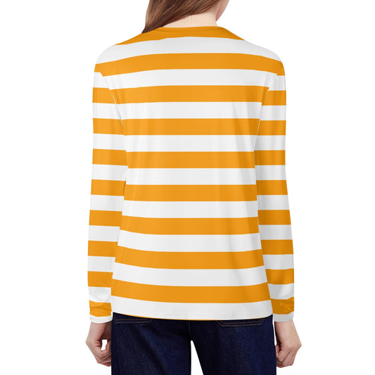 Orange and White Striped Women Long Sleeve Tshirt, Designer Stripe Graphic Aesthetic Costume Crew Neck Ladies Female Tee Top Shirt