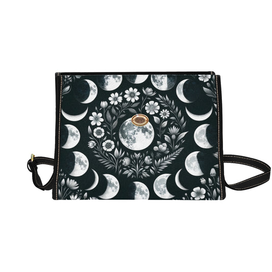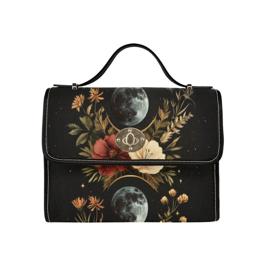 Moon Floral Canvas Satchel Bag, Night Sky Flowers Cottagecore Witchy Waterproof Black Cute Women Crossbody Purse Vegan Leather Strap Handbag