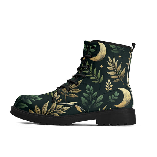 Forest Moon Women Leather Boots, Witchy Boho Green Vegan Lace Up Shoes Hiking Festival Black Ankle Combat Work Cottagecore Waterproof Ladies