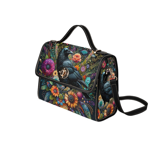 Black Crow Satchel Purse bag, Floral Wildflowers Cottagecore Boho Small Witch Waterproof Cute Women Crossbody Vegan Leather Strap Handbag