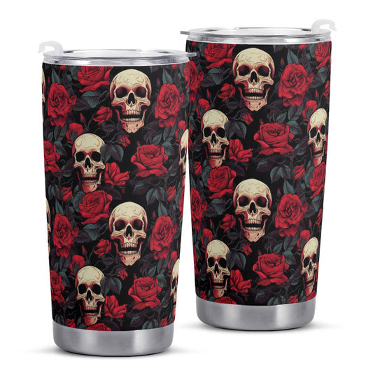 Skull Red Roses Stainless Steel 20oz Tumbler Travel Mug, Gothic Halloween Coffee Cup Vacuum Insulated Traveler Car Men Women Eco Friendly