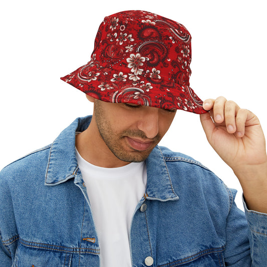 Red Paisley Bucket Cap Hat, Bandana Beach Cool Women Men Golf Retro Vintage Summer Festival Cute Designer Sun Shade Ladies Guys
