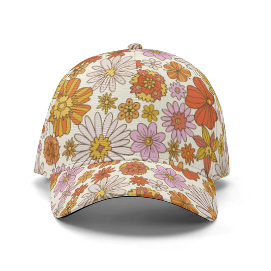 Retro Floral Baseball Hat Cap, Vintage Flowers Groovy 70s Pink Orange Ball Dad Mom Trucker Men Women Male Ladies Aesthetic Designer Hat
