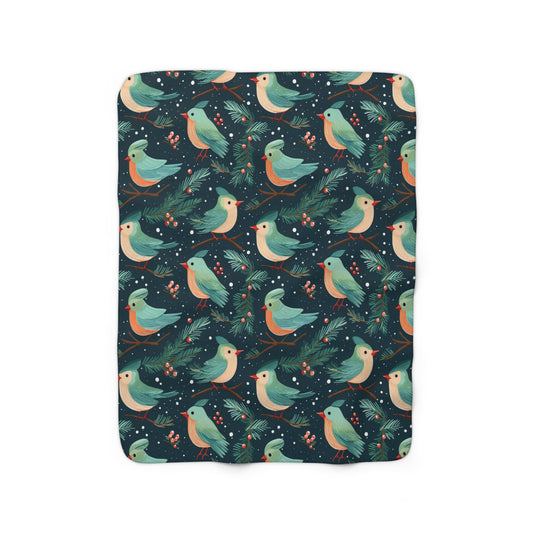 Christmas Birds Sherpa Fleece Blanket, Green Xmas Berries Throw Soft Fluffy Cozy Warm Adult Kids Large Home Decor Gift Bed