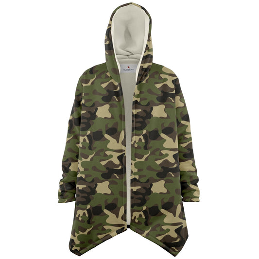Green Camo Hooded Cloak, Camouflage Men Women Male Ladies Modern Winter Warm Mink Blanket Festival Rave Wearable Cape with Pockets