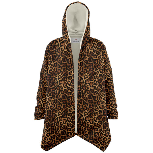 Leopard Hooded Cloak, Animal Cheetah Print Brown Men Women Modern Winter Warm Mink Blanket Male Festival Rave Wearable Cape Coat Pockets