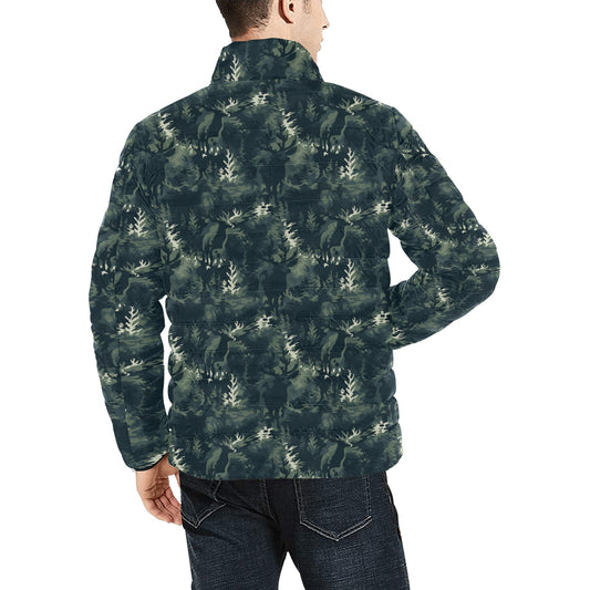 Green Camo Men Lightweight Bomber Jacket, Camouflage Deer Silhouette Stand Collar Padded Streetwear Quilted Winter Warm Coat