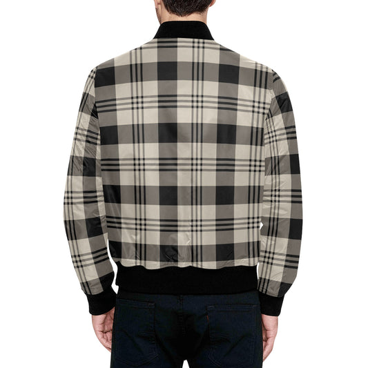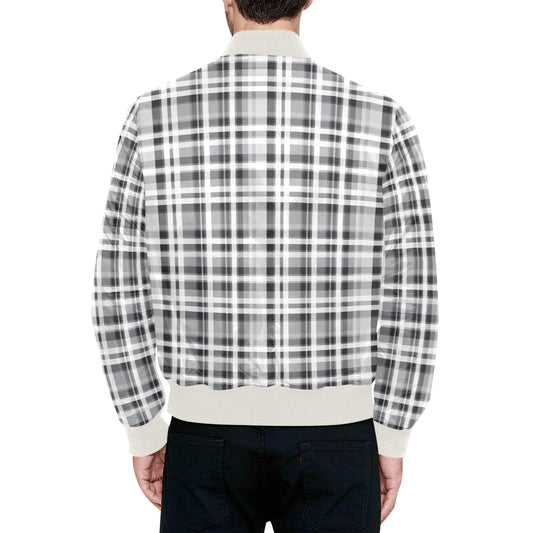 Grey Cream Plaid Men Quilted Bomber Jacket, Black Tartan Check Zip Up Unisex Winter Vintage Flight Varsity Warm Designer Coat Outfit