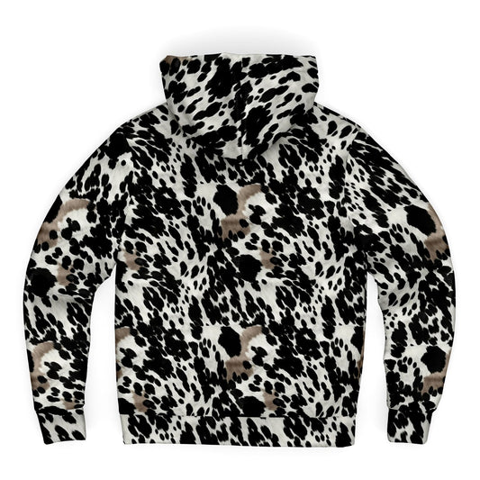 Cow Print Zip Up Fleece Lined Hoodie, Black White Brown Heavyweight Full Zipper Pocket Men Women Unisex Graphic Hooded Sweatshirt Jacket