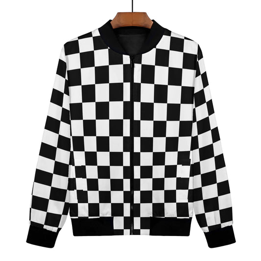 Checkered Women Bomber Jacket, Racing Black White Check Ladies Female Zip Up Streetwear Winter Vintage Varsity Warm Designer Coat Plus Size