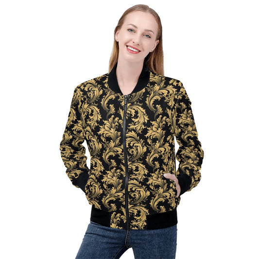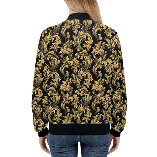 Black Gold Print Women Bomber Jacket, Baroque Ladies Female Zip Up Streetwear Winter Vintage Pilot Varsity Warm Designer Coat Plus Size