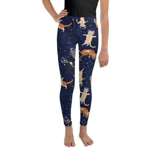 Galaxy Cats in Space Girls Leggings (8-20), Blue Stars Kittens Themed Youth Funny Teen Cute Printed Kids Yoga Pants Graphic Fun Tights Gift