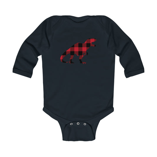 Trex Dino Baby Long Sleeve Bodysuit, Red Buffalo Plaid Check Dinosaur Infant Graphic Tshirt Cute Shirt New Baby Clothes One Piece Boy Girl